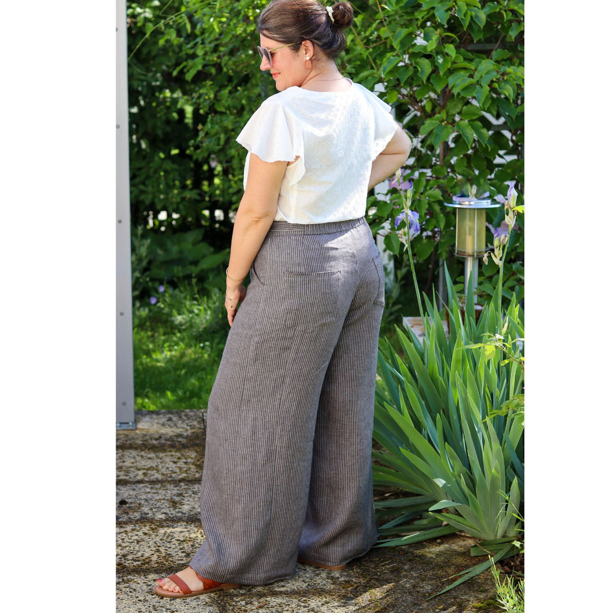 Hose Liberté kann als ganz schlichte Variante genäht werden oder aber mit einem schönen Bindedetail am Saum. Durch den Gummibund ist die Hose sehr bequem, sieht aber mit dem Fake-Reißverschluss wie eine klassisch elegante Hose aus, was mir wirklich gut gefällt.